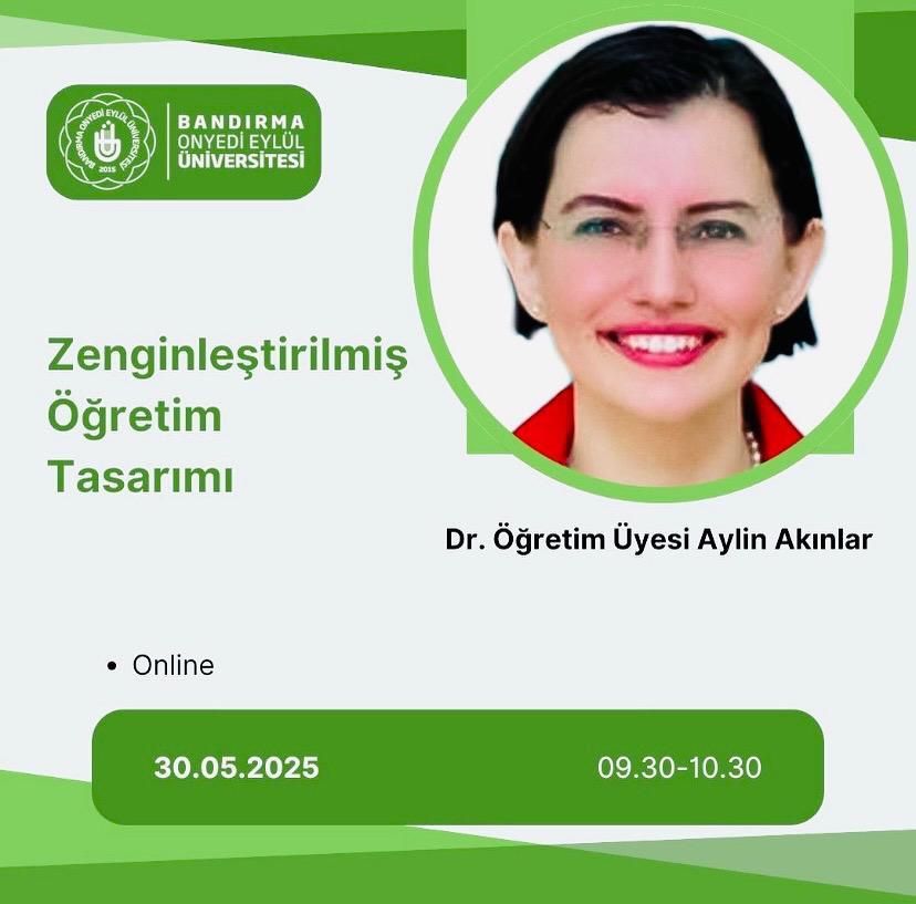 Bandırma Onyedi Eylül Üniversitesi Rektörlüğü Kalite Koordinatörlüğünün Eğiticinin Eğitimi kapsamında düzenlediği etkinlikler çerçevesinde; Fakültemiz Halkla İlişkiler ve Reklamcılık Bölümünden Dr. Öğretim Üyesi Aylin AKINLAR tarafından 30 Mayıs 2025 Cuma günü 09.30-10.30'da "Zenginleştirilmiş Öğretim Tasarımı" çevrimiçi semineri üniversitenin tüm akademik personeline yönelik olarak verilmiştir. İlgili seminerde;