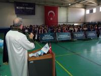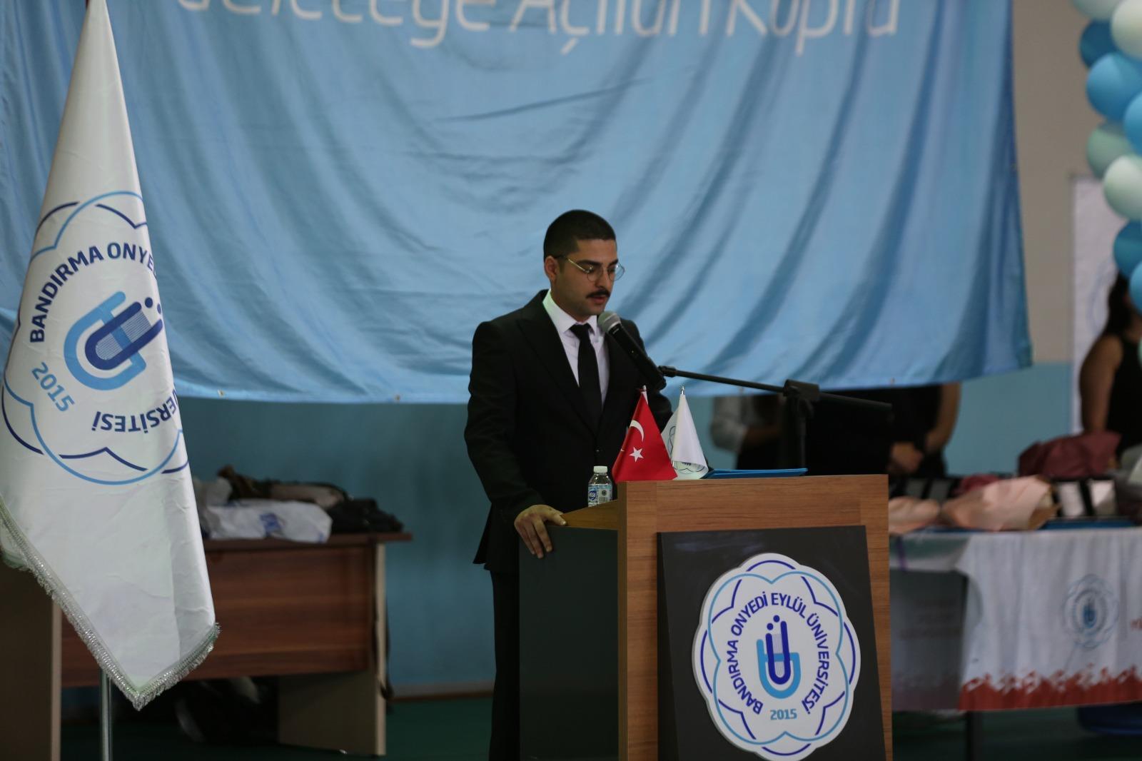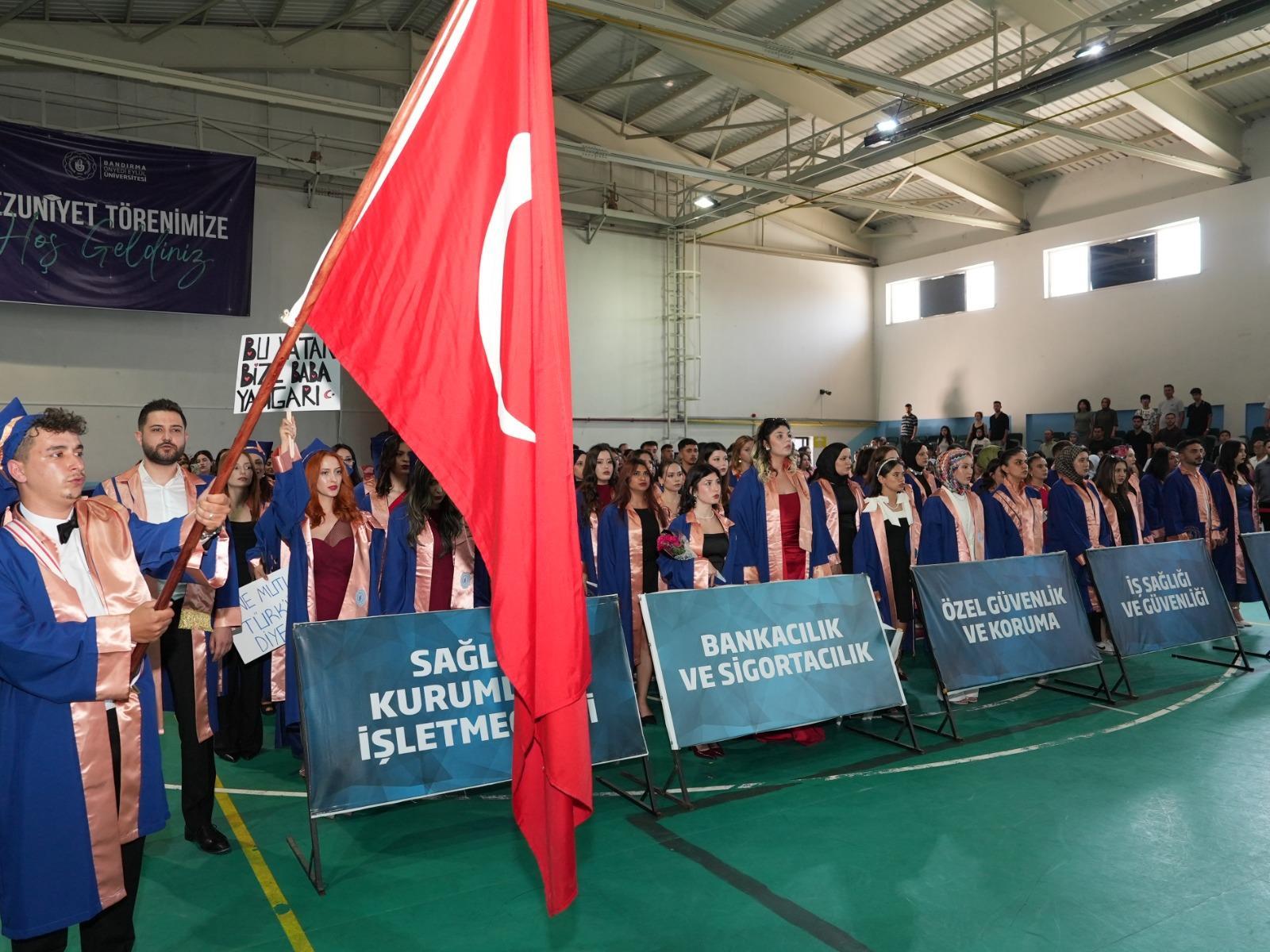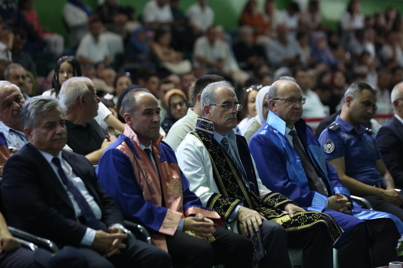 Our Manyas Vocational School graduation ceremony was held with great enthusiasm. The ceremony, which took place in the Manyas Indoor Sports Hall and was hosted by our Manyas Vocational School Director Assoc. Prof. Dr. Ufuk Bingöl, was attended by our Rector Prof. Dr. İsmail Boz, our Vice Rector Prof. Dr. Mehmet Emin Erçakar, our Secretary General Cihangir Boz, District Gendarmerie Commander Fatih Ergün, District Police Chief V. Furkan Işık, Manyas District National Education Director Abdulmüttalip Erek, our academic and administrative staff, members of the press, our students and their valuable relatives. The graduation ceremony, which started with a moment of silence and the singing of our National Anthem, was opened by our Manyas Vocational School Director Assoc. Prof. Dr. Ufuk Bingöl. Our Rector Prof. Dr. İsmail Boz, who made the greeting speech, wished our graduates success in their careers. Our Private Security and Protection Program Student Keziban Gümüş, who graduated from Manyas Vocational School in the 2024-2025 academic year with the first place, performed a plaque nailing ceremony on behalf of all our graduates and expressed her excitement and happiness in her speech afterwards.